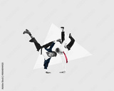 Flat design. A group of multicultural young business people are breakdancing outdoors in business outfits.