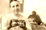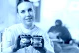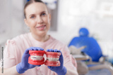 Closeup invisalign aligner or system of braces for straightening teeth on dental models in clinic, portrait Caucasian female dentist orthodontic