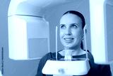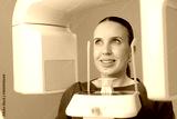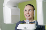 Caucasian female adult smiling during dental x-ray examination in modern stomatology