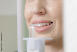 Caucasian female adult undergoes dental imaging with advanced scan machine