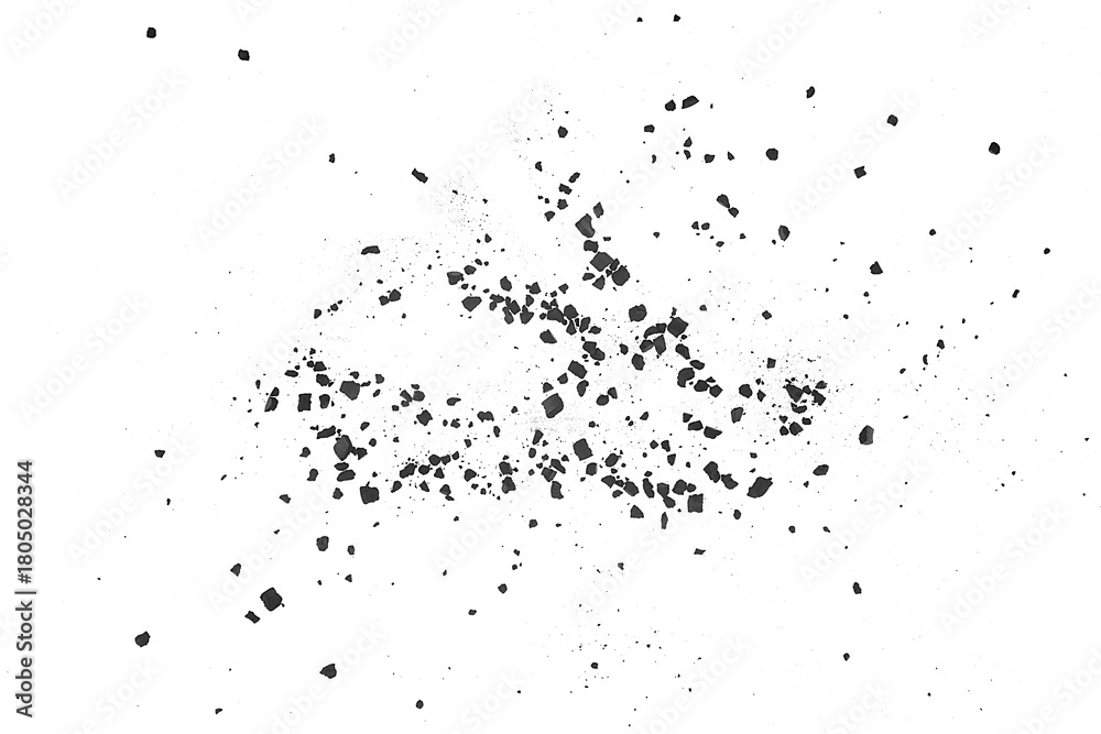 Particles of charcoal on a white background, view from above. Small pieces of black coal dust.