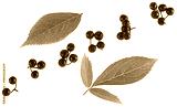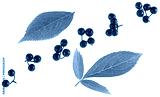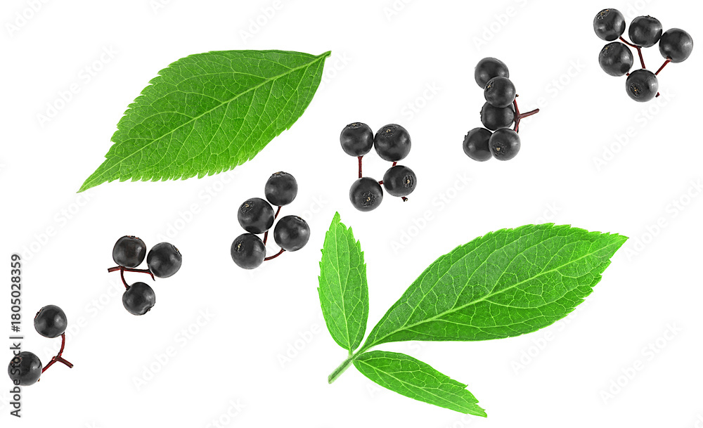 Ripe black elderberries with green leaves isolated on a white background, top view. Sambucus berries.