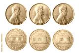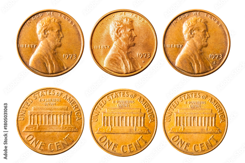 Isolated photo of 1 Lincoln memorial cent USA 1973 P, D and S coins on white background.