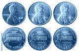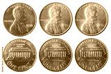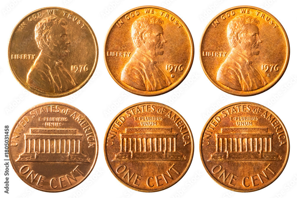 Isolated photo of 1 Lincoln memorial cent USA 1976 P, D and S coins on white background.