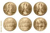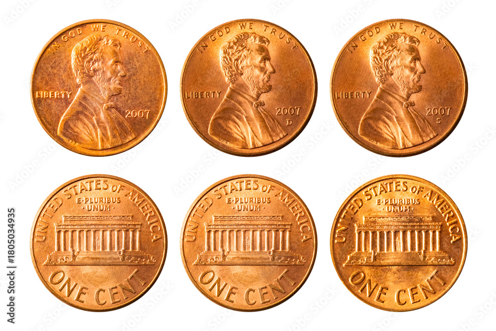 Isolated photo of 1 Lincoln memorial cent USA 2007 P, D and S coins on white background.