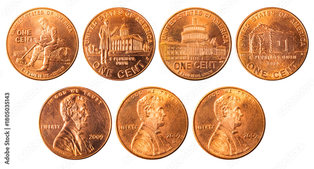Isolated photo of 1 Lincoln commemorative cent USA 2009 P, D and S coins on white background.