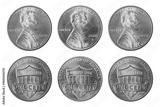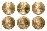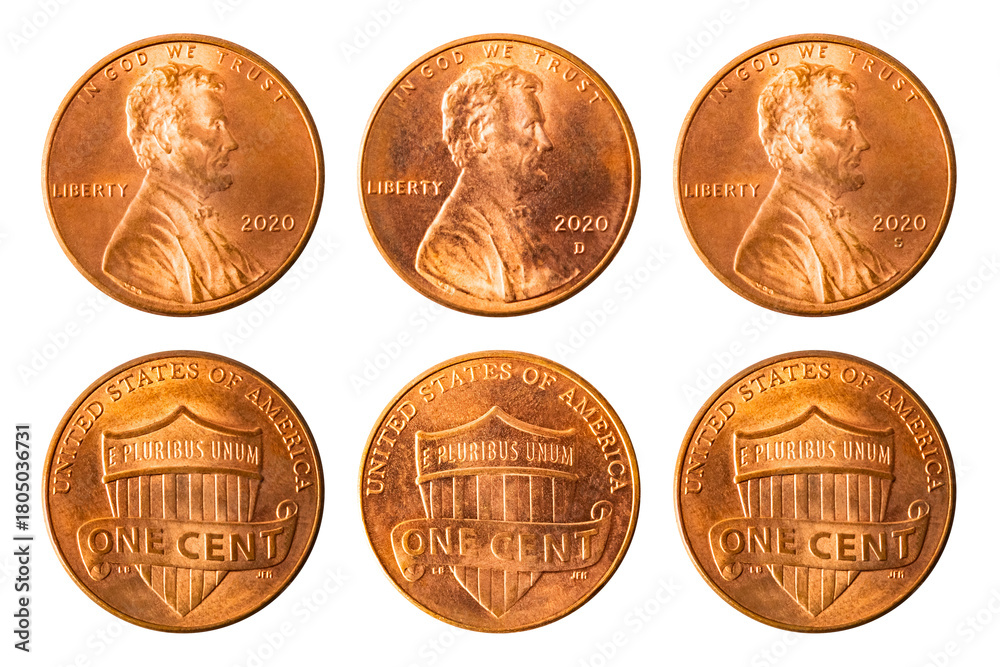 Isolated photo of 1 Lincoln shield cent USA 2020 P, D and S coins on white background.