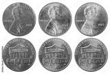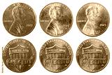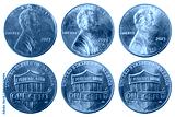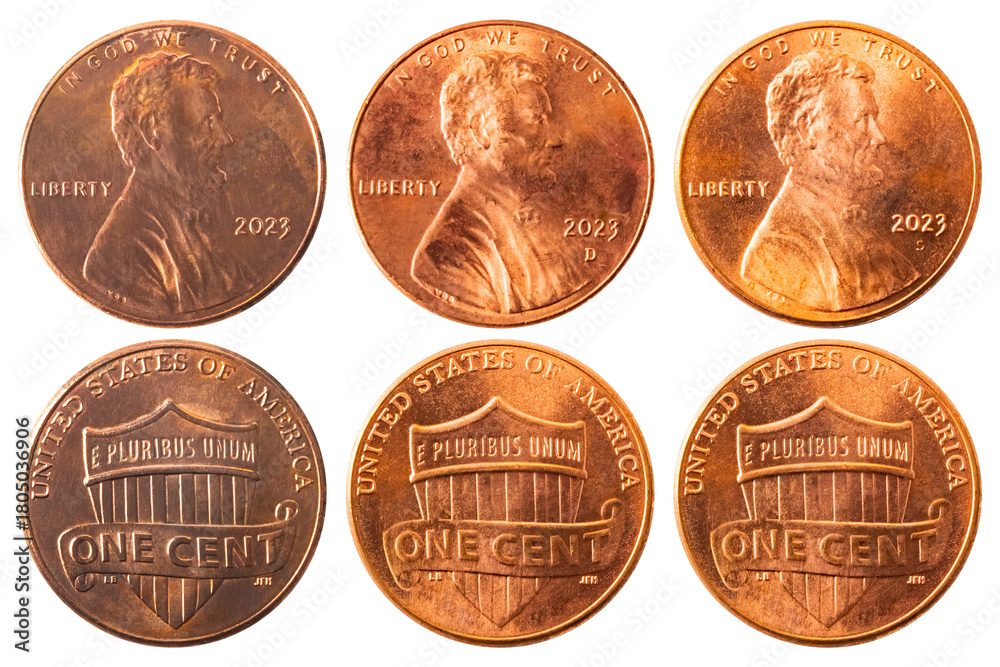 Isolated photo of 1 Lincoln shield cent USA 2023 P, D and S coins on white background.
