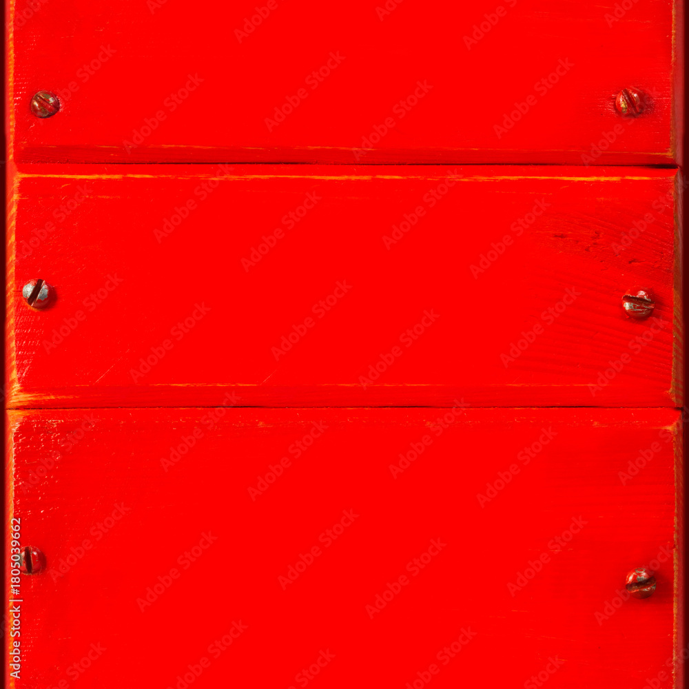 Seamless 4k photo texture of red painted wood planks with screws. Fence or box surface material.