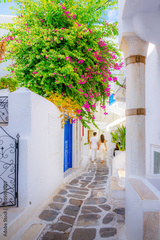 A young couple walks past blooming bougainvillea flowers on a narrow whitewashed alley in old town Mykonos, Greece, on the island of Mykonos