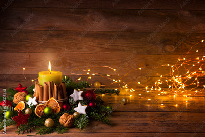 Festive Christmas or Advent Background - Burning candle with natural decoration on rustic wood