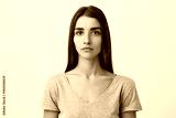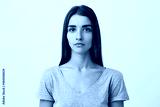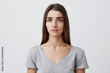 Close up of young handsome charming caucasian girl with long brown hair in gray t-shirt looking in camera with serious face expression. Woman getting photo for passport.