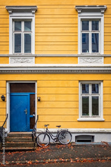 Old vintage bicycle parked under the windows of an old yellow house in the Bergen