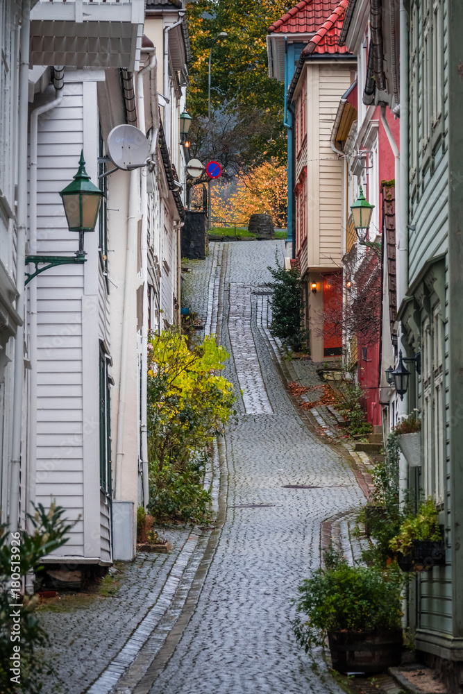 Narrow cobble stoned streets between traditional colorful houses in the old part of Bergen