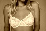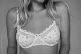 Close-up of a young blonde woman in delicate floral lace lingerie, showing soft feminine curves and smooth skin on a light pastel background, highlighting elegance, youth and gentle beauty
