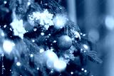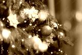 Banner New Year background, Festive christmas tree with glittering ornaments and warm lighting ambiance