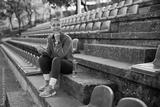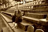 Mature athletic woman listening music over earbuds while relaxing on staircase during outdoor workout.