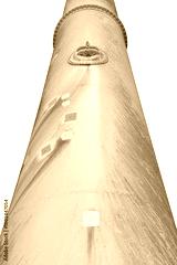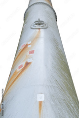 massive cylindrical metal water pipe extends vertically in a low-angle perspective, orange rust streaks. The industrial vessel features visible seam rings and a circular access hatch