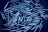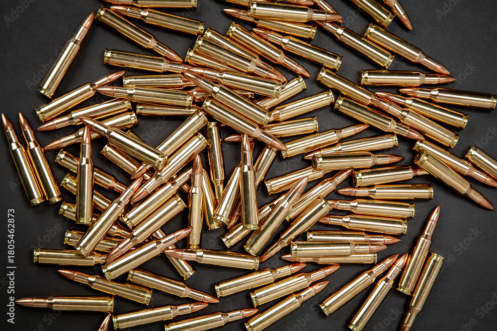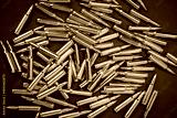 A large pile of golden brass rifle cartridges scattered across a dark back