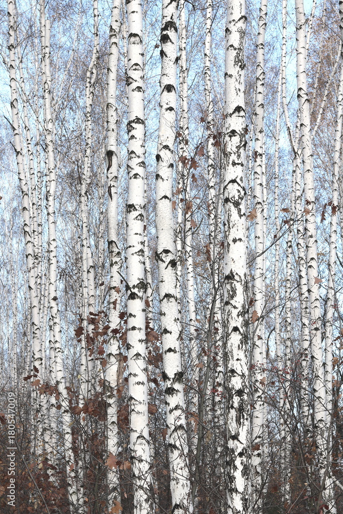Trunks of birch trees in forest / birches in sunlight in spring / birch trees in bright sunshine / birch trees with white bark / beautiful landscape with white birches