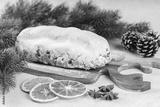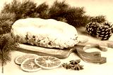 Traditional Christmas Stollen, sweet fruit loaf with sugar icing on wooden board and festive decor