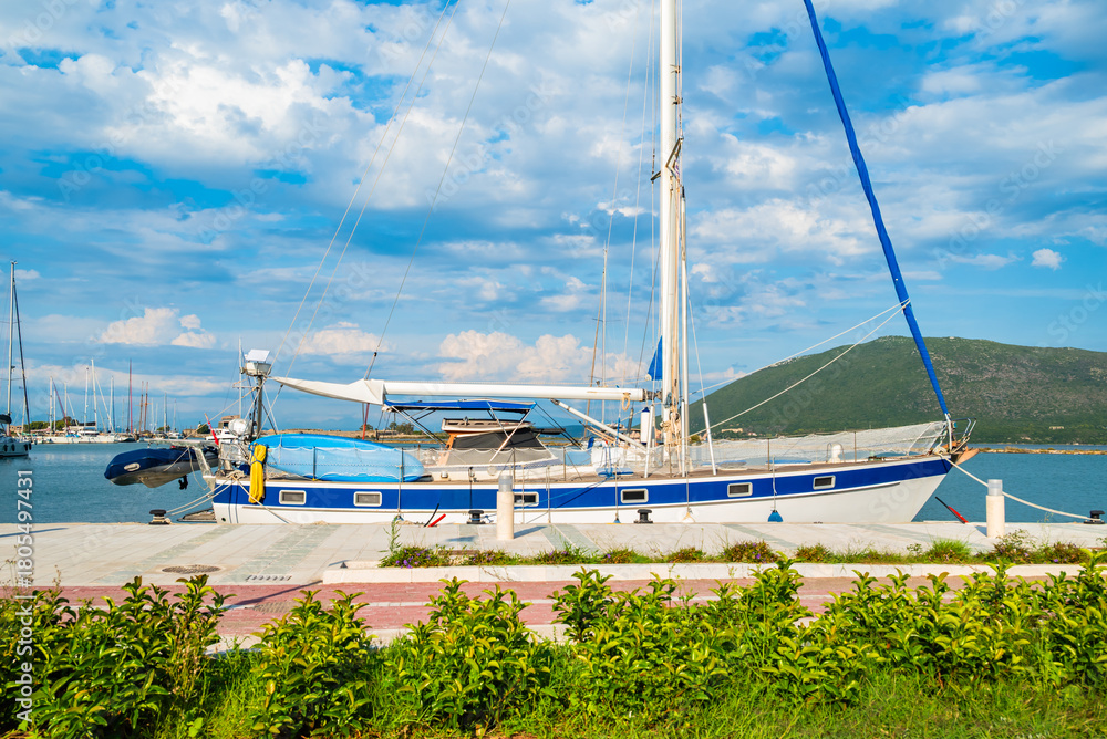 Sailboat on shore and view of Lefkada port, Lefkada island, Greece