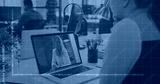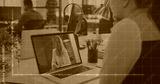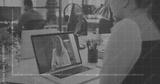 Viewing laptop showing seated woman in light colored blouse in open-plan office, with headphones