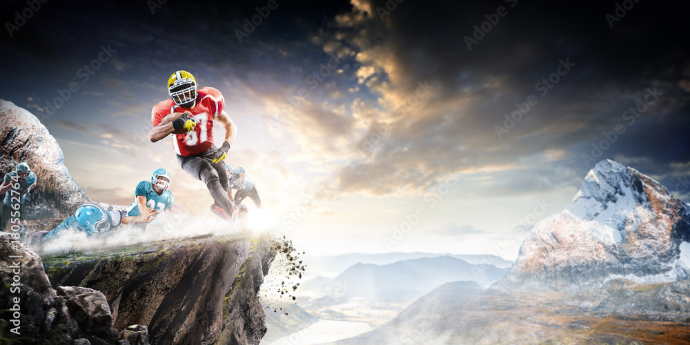 American football players in action high in the mountains on the edge of a cliff. Sports concept. Extreme sports moment. Panorama. Cliff. American football players in rock