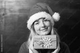 Portrait of a beautiful cheerful girl in Santa Claus hat red shirt and white knitted scarf holding a present gift box in hands