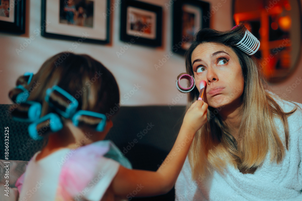 Little Girl Puts Makeup on Her Mom Using a Blush Brush. Funny mom being skeptical about her looks during makeup playtime