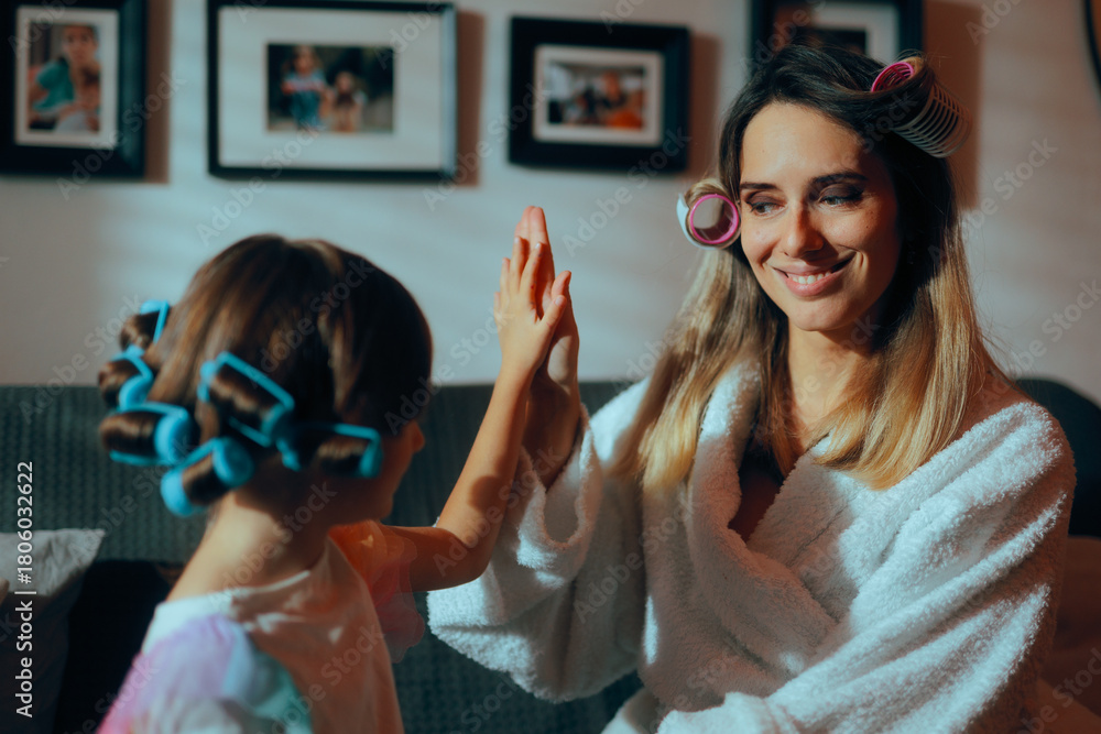 Mother and Daughter Making High Five After Having Curlers on. Happy mom and her little girl being best friends for life