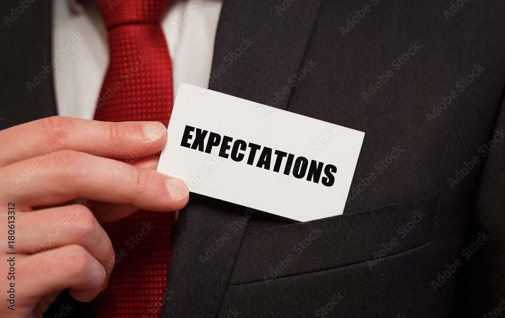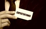 Businessman putting a card with text EXPECTATIONS in the pocket
