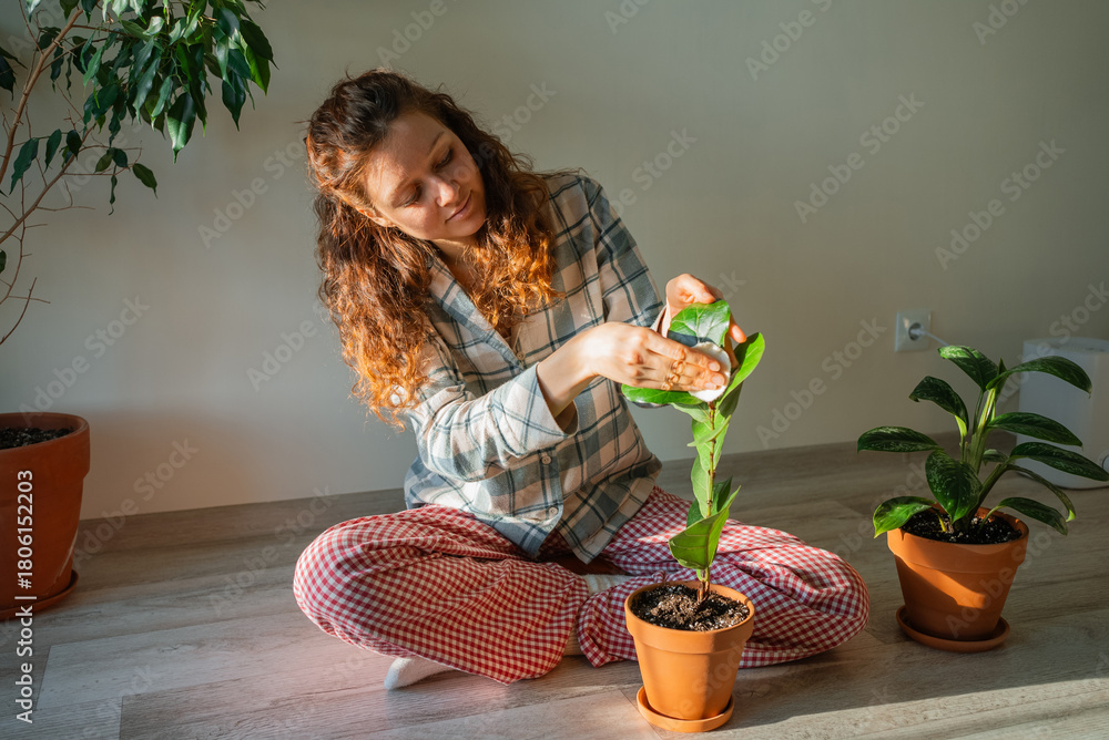 Woman sitting on the floor, gently cleaning dust from the green leaves of a ficus lyrata houseplant, showing dedication to plant care and a hobby in indoor gardening during leisure time