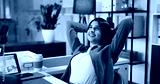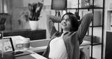 Woman, relief and complete project at startup, smile and relax with tech, reflection and deadline at office. Person, happy and thinking with task done, target or finished on break at creative agency