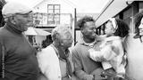 Smile, interracial family and relax with child in backyard for love, visit grandparents and bonding. Happy, parents and laughing with kid for care, trust and playful together for childhood at house
