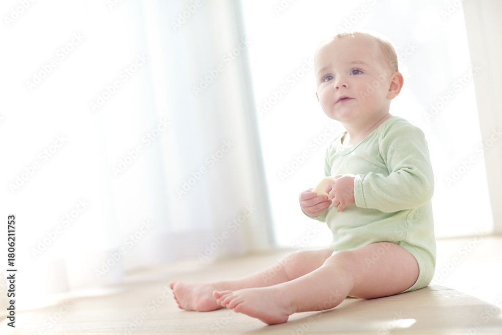 Food, milestone and teething biscuit with toddler on floor in living room for growth. Child development, eating and pain relief with infant kid in apartment for baby teeth symptoms or swollen gums