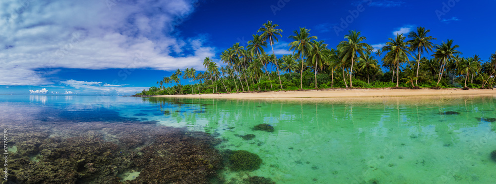 Uninhabited tropical island with word help in deserted sand beach, concept of sos, lost and shipwreck.