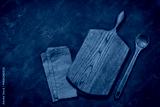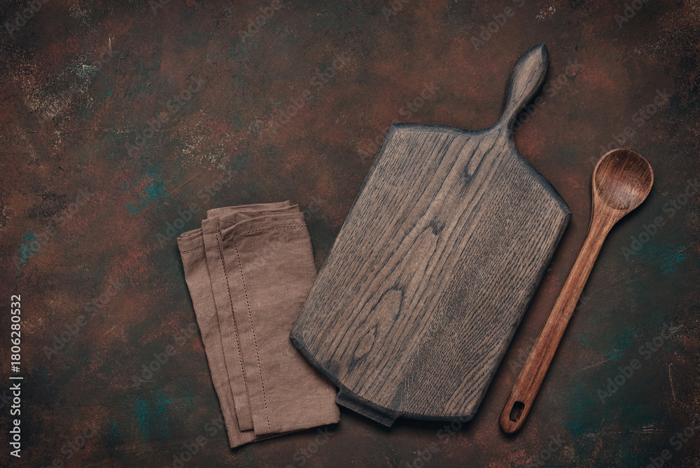 Culinary background with empty wooden cutting board, wooden spoon and linen napkin, dark brown grunge background, top view, flat lay, copy space