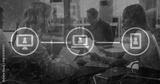 Discussing project, four coworkers wearing business attire at table in office with laptops overlay