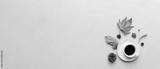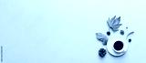 Flat lay composition with colorful Autumn cup of coffee and leaves on a color background. top view