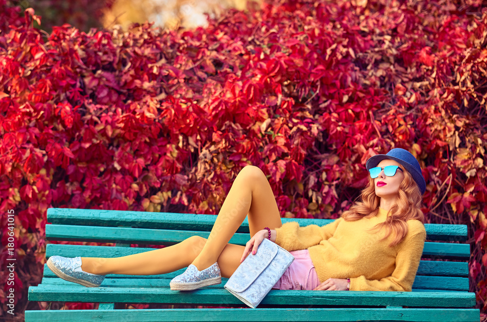 Fall Fashion. Young Woman Sitting on Bench in Sunny Colorful Park. Enjoy Nature, Urban Outdoor. Redhead Model in Stylish fashion Autumn Outfit. Girl in Trendy Jumper