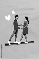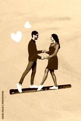 Vertical pop art trend banner collage of two happy lovers girl guy dance flute party celebration family day love heart icon