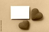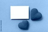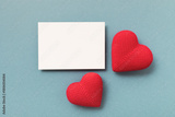 Knitted red hearts and clean paper blank on blue background for Valentine day greeting card.