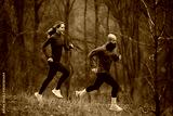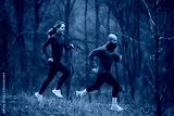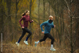Couple trail running through autumn forest on energetic uphill path. Concept of outdoor fitness, tourism promo, fall lifestyle, sports guides, motivation and endurance training.