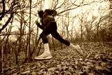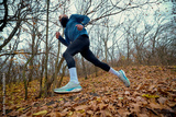 Runner captured mid-stride on autumn hillside trail showing powerful leg drive. Concept of sportswear testing, motion analysis, athletic coaching and performance-focused education.