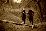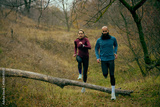 Runners jumping over fallen tree on narrow forest trail. Concept of trail cardio, outdoor routine, coordination training, nature movement, healthy active habit.