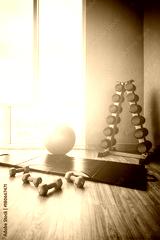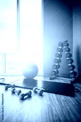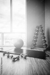 healthy concept with fitness center dumbell rack and yoga ball with exercise mat on wooden floor with background of blue sky