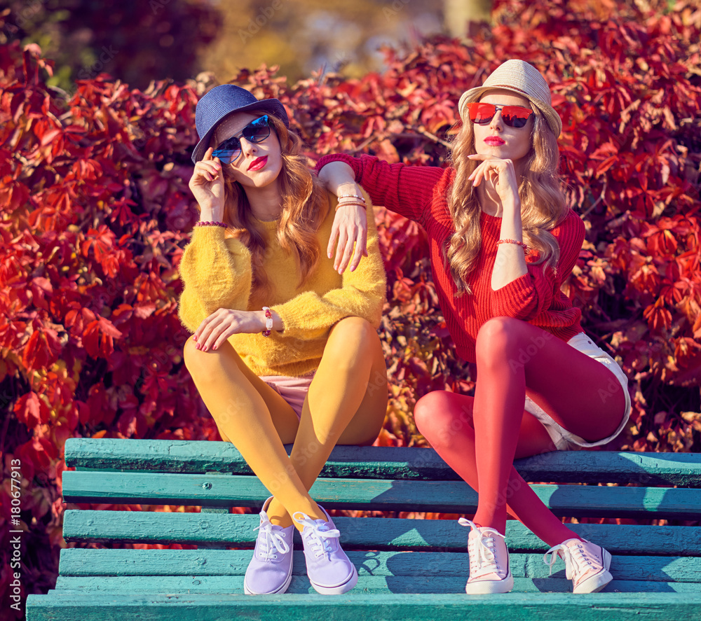 Fall Fashion. Two Girls Sitting on Bench in Colorful Park. Young Woman Enjoy Nature, Urban Outdoor. Friends Model in Stylish Trendy fashion Autumn Outfit, Glamour Sunglasses