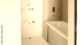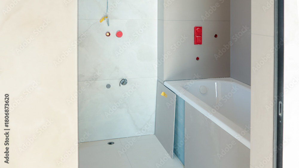 Bathroom renovation in progress with a new bathtub and tiled walls