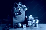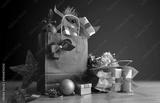 Red gift bags full of gift packages and Christmas decorations